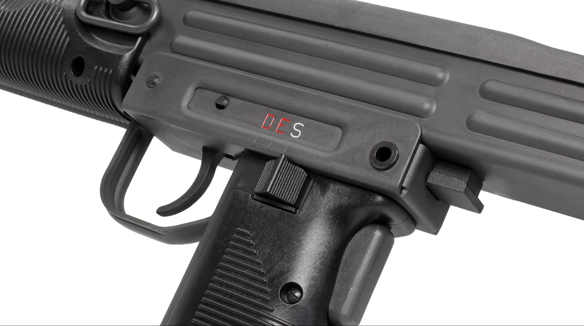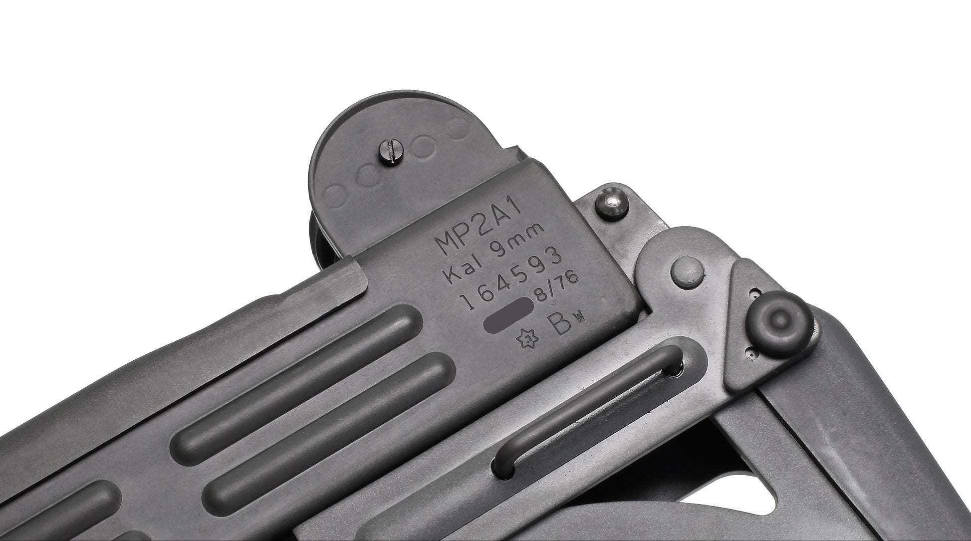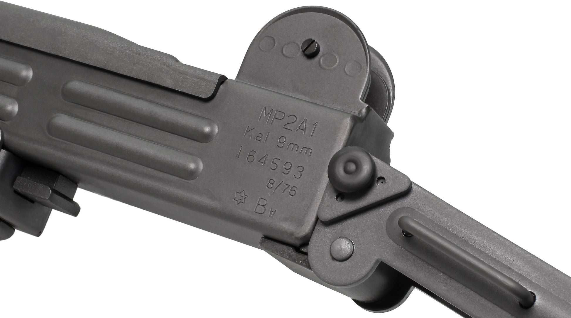 After the new gun was adopted, it was designated as the MP2 for the wooden fixed-stock version, and the MP2A1 for the folding-stock version. It also sported German-language selector switch markings: D (Dauerfeuer; "continuous fire")、E (Einzelfeuer; "single fire"), and S (Sicher; "safe").