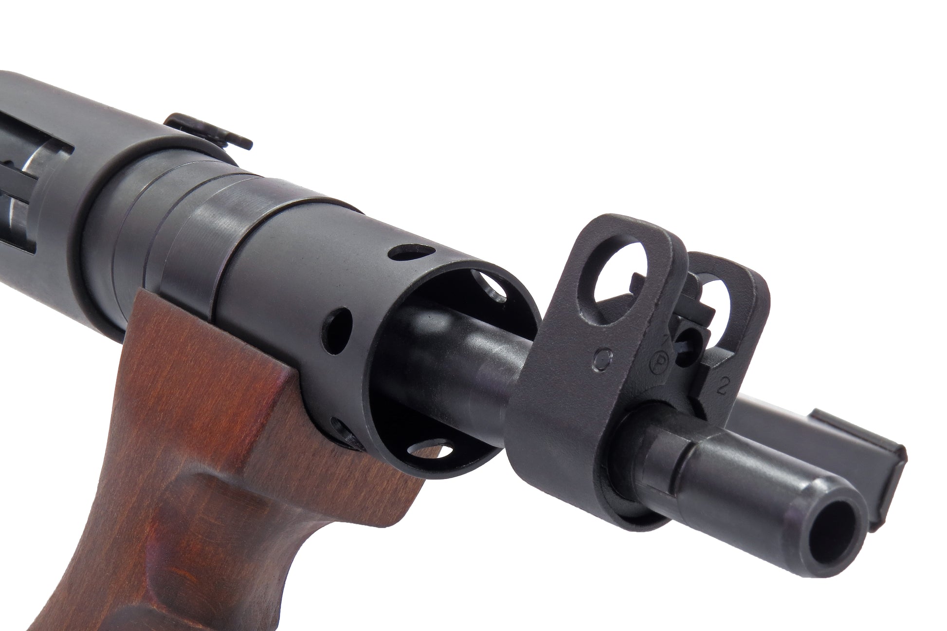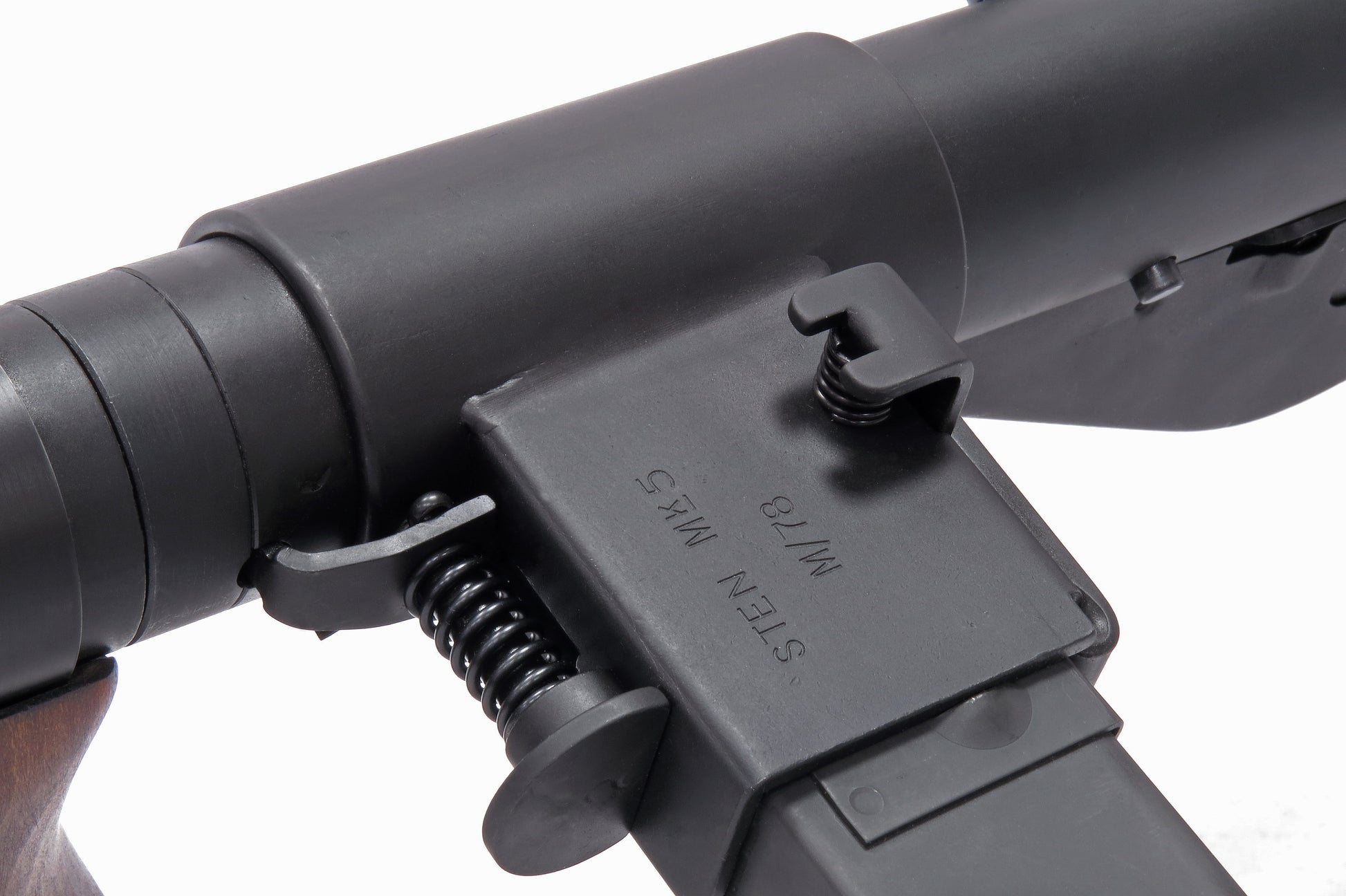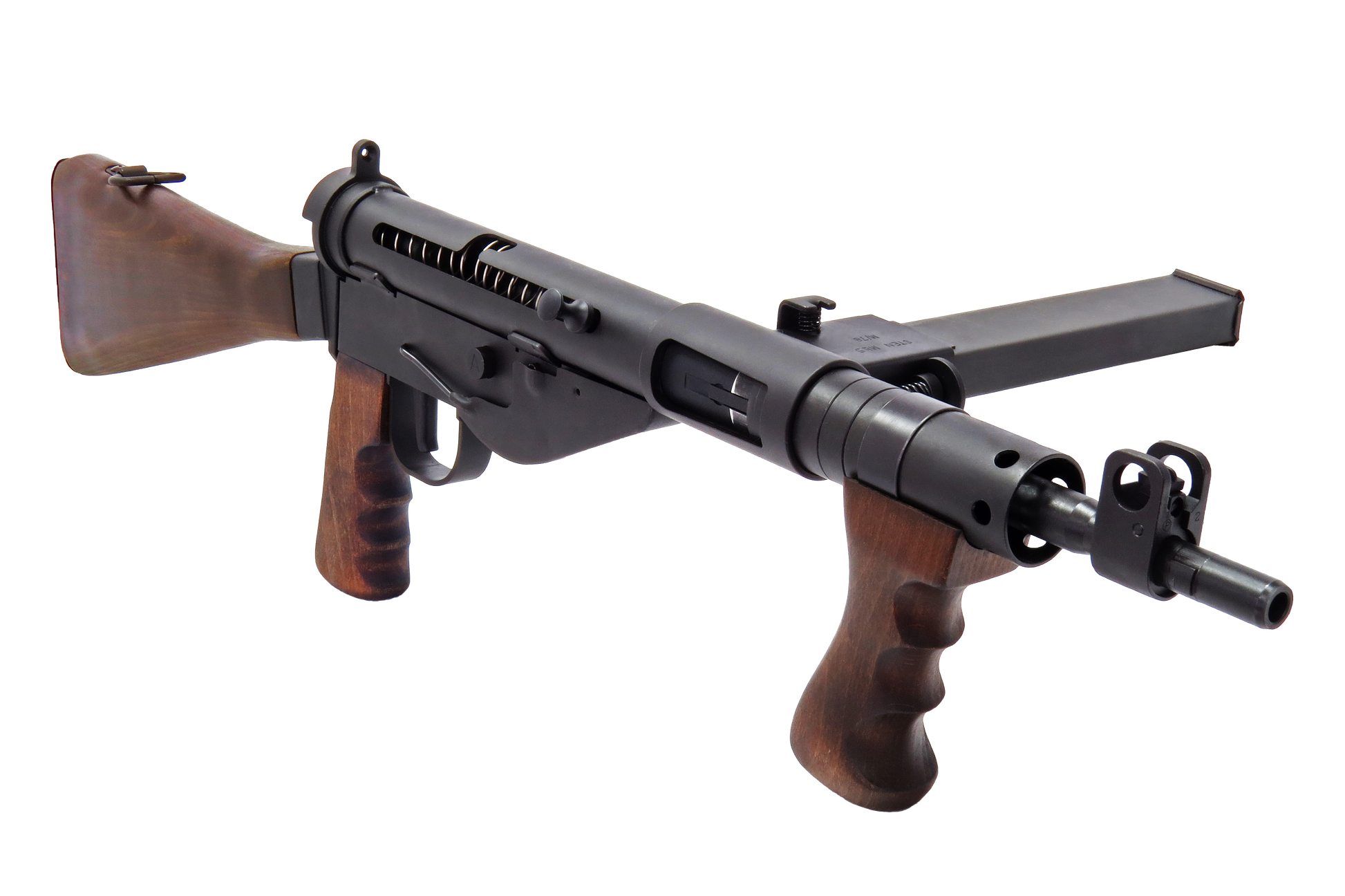The STEN (Shepherd Turpin Enfield) Mk.5 is a better-quality, more elaborate version of the Mk.2 that was introduced in 1944. Upgrades included wooden pistol and fore grips, wooden stock, bayonet mount, and a Lee Enfield No.4 front sight. All of these upgrades made the STEN Mk.5 easier to control and more solid than its more rushed predecessors.